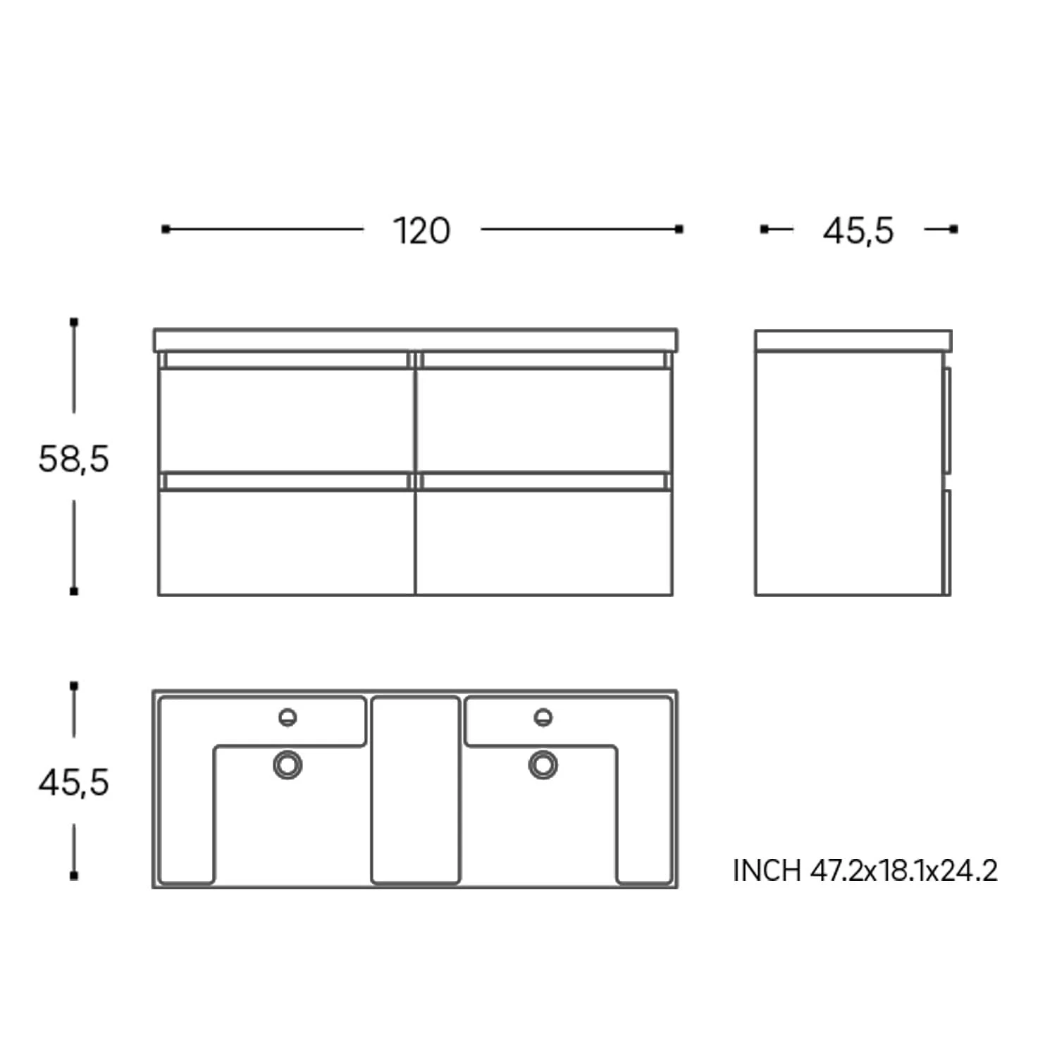 - B: 120 cm T: 45 cm H: 56,5 cm