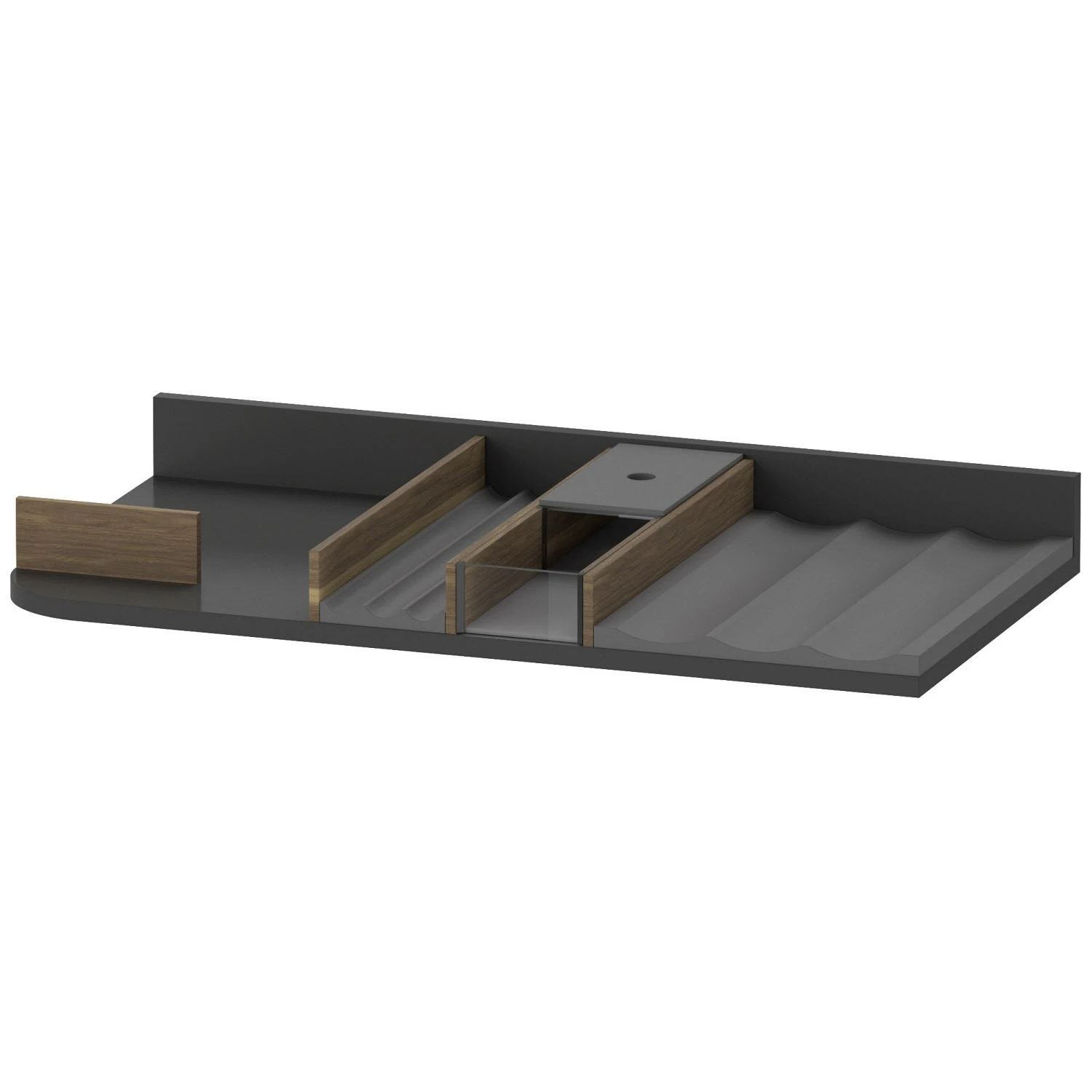 - Die Böden, der Boxendeckel, die kleine und große Ablagewelle sowie die Halterung für die Haarbürsten sind mit einem speziellen rutschhemmenden Lack versehen