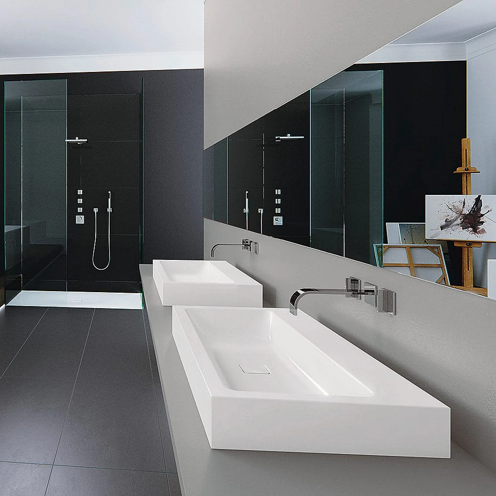 Optimal integrierter emaillierter Ablauf zur vollkommenen Abrundung des geometrischen Erscheinungsbildes und eine äußerst großzügige Fläche für Armatur und individuelle Accessoires