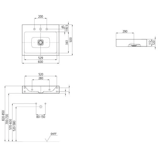 Kaldewei Cono Wandwaschtisch 3089 mit 3 Hahnlochbohrung, 60 cm