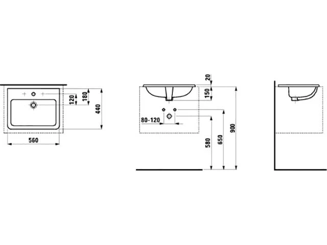 LAUFEN Pro S Einbauwaschtisch 56 cm von oben, ohne Hahnloch, mit Überlauf