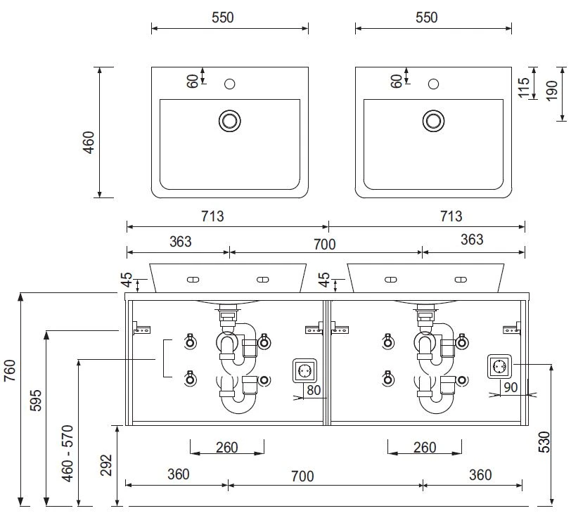 - je 1 Schubkasten mit Einzugsdämpfung und Siphonausschitt