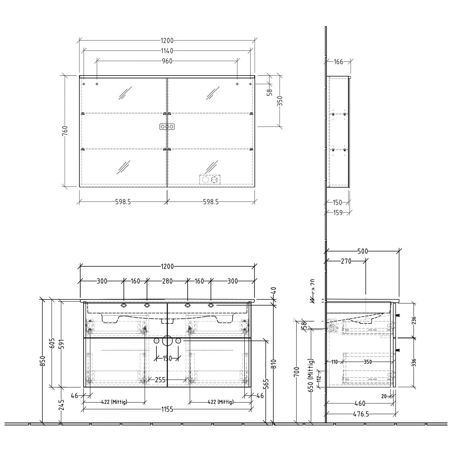 Waschtisch nur mit Möbeln montierbar, keine freitragende Montage möglich.