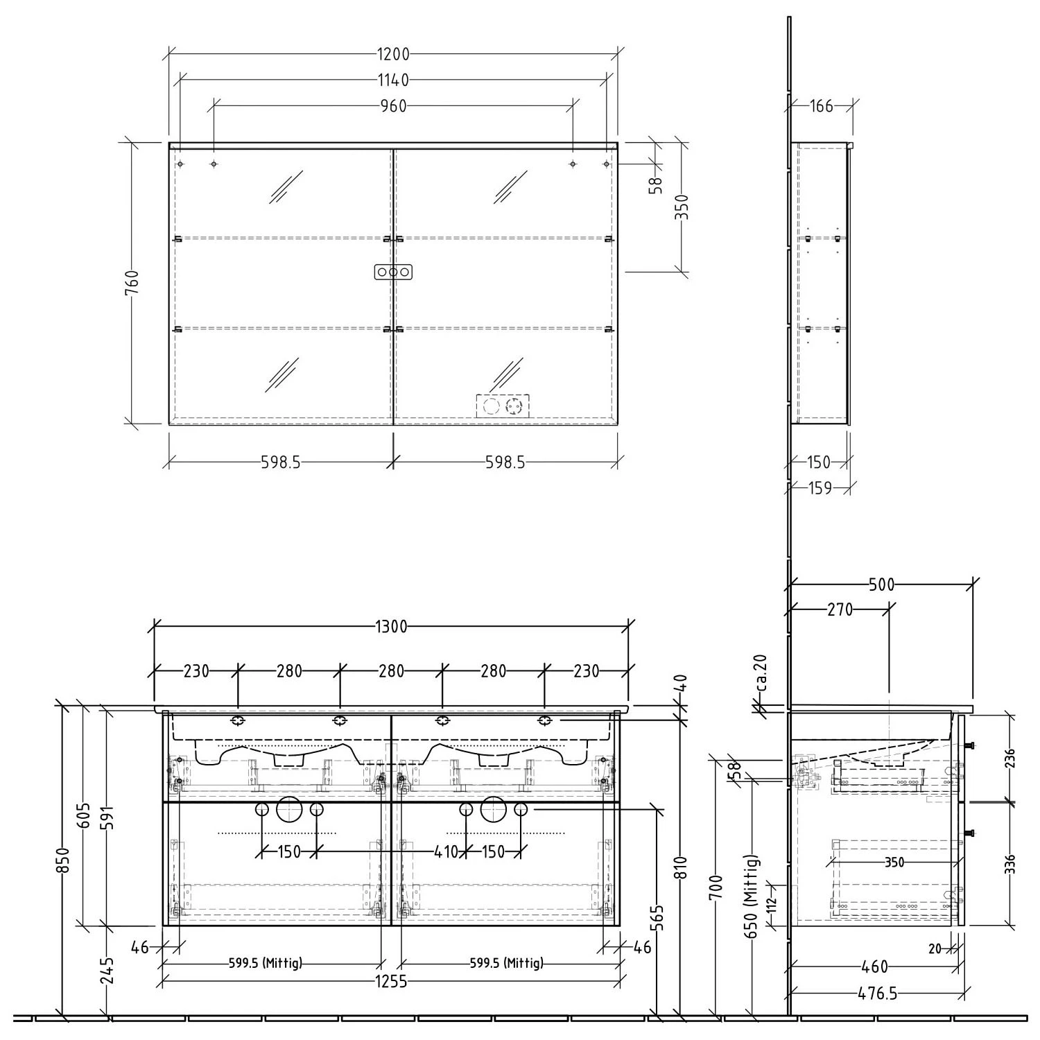 Waschtisch nur mit Möbeln montierbar, keine freitragende Montage möglich.