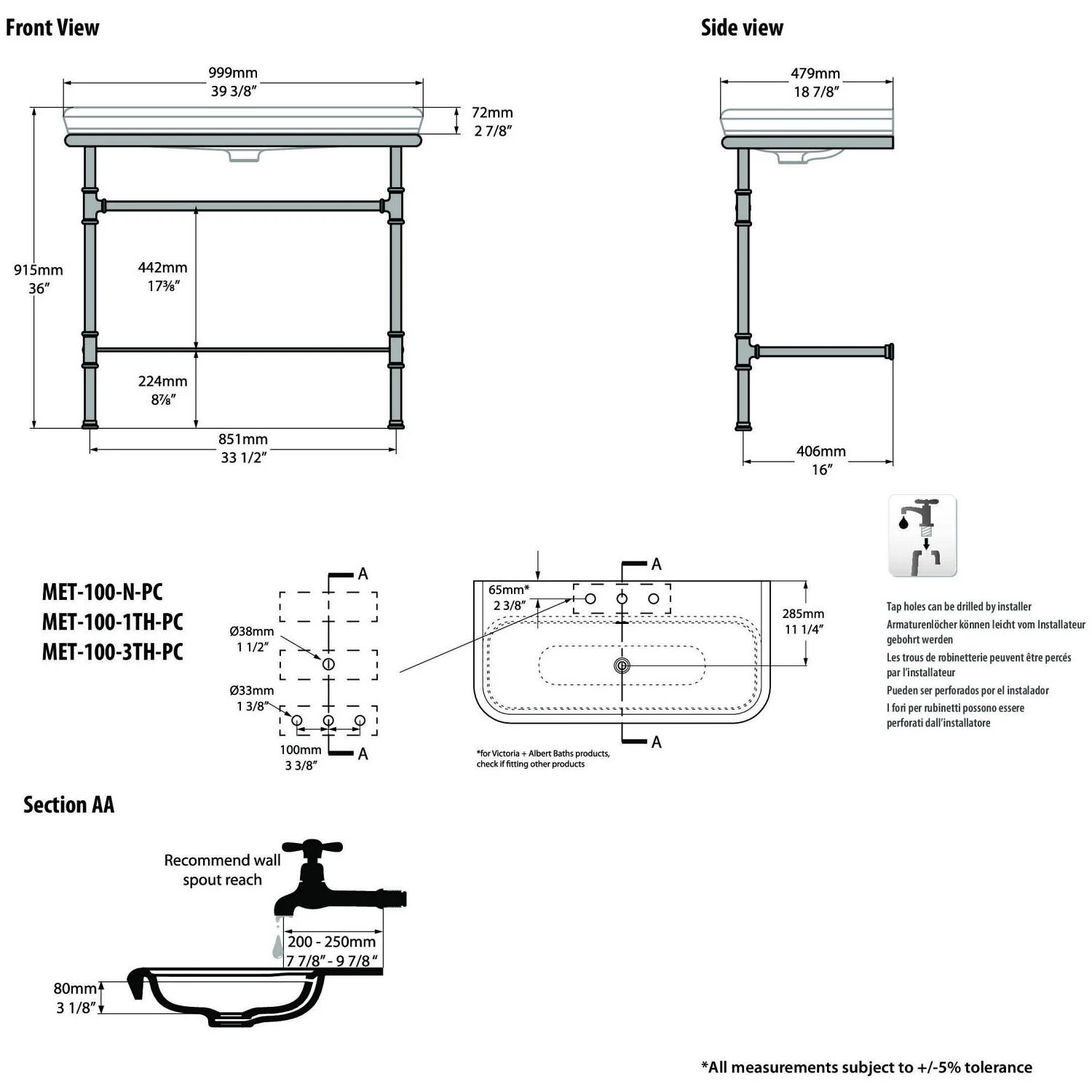 Victoria & Albert Metallo 100 Waschtisch mit 2 Füßen, 3 Armaturlöcher