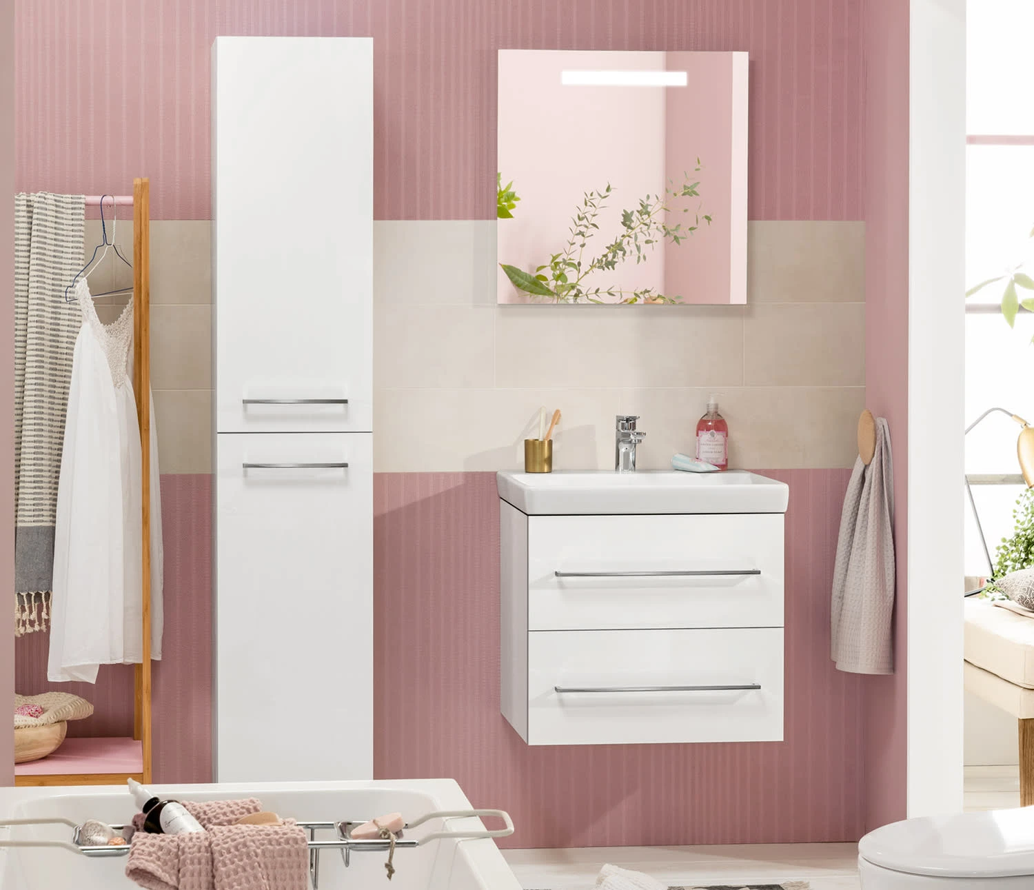 Das Avento Badmöbel ist trendig und praktisch. Hier trifft frisches Design auf zeitgemäße Funktionalität. Das Möbel verfügt über stilvoll aufgesetzte Chrom-Griffe und champagnerfarbene Dekorkanten. Bei der Tür sorgt die moderne SoftClosing Technologie für sanftes und lautloses Schließen. Sie wird durch den Mechanismus abgebremst und per Selbsteinzug langsam und geräuschlos zugezogen.