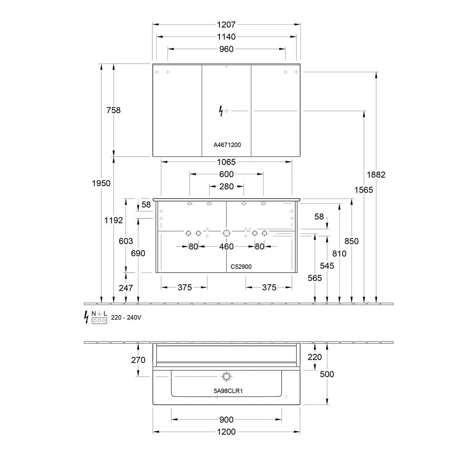 - Maße Spiegelschrank: B: 120,7 T: 15,9 (bzw. 22 inkl. Leuchte) H: 75,8 cm