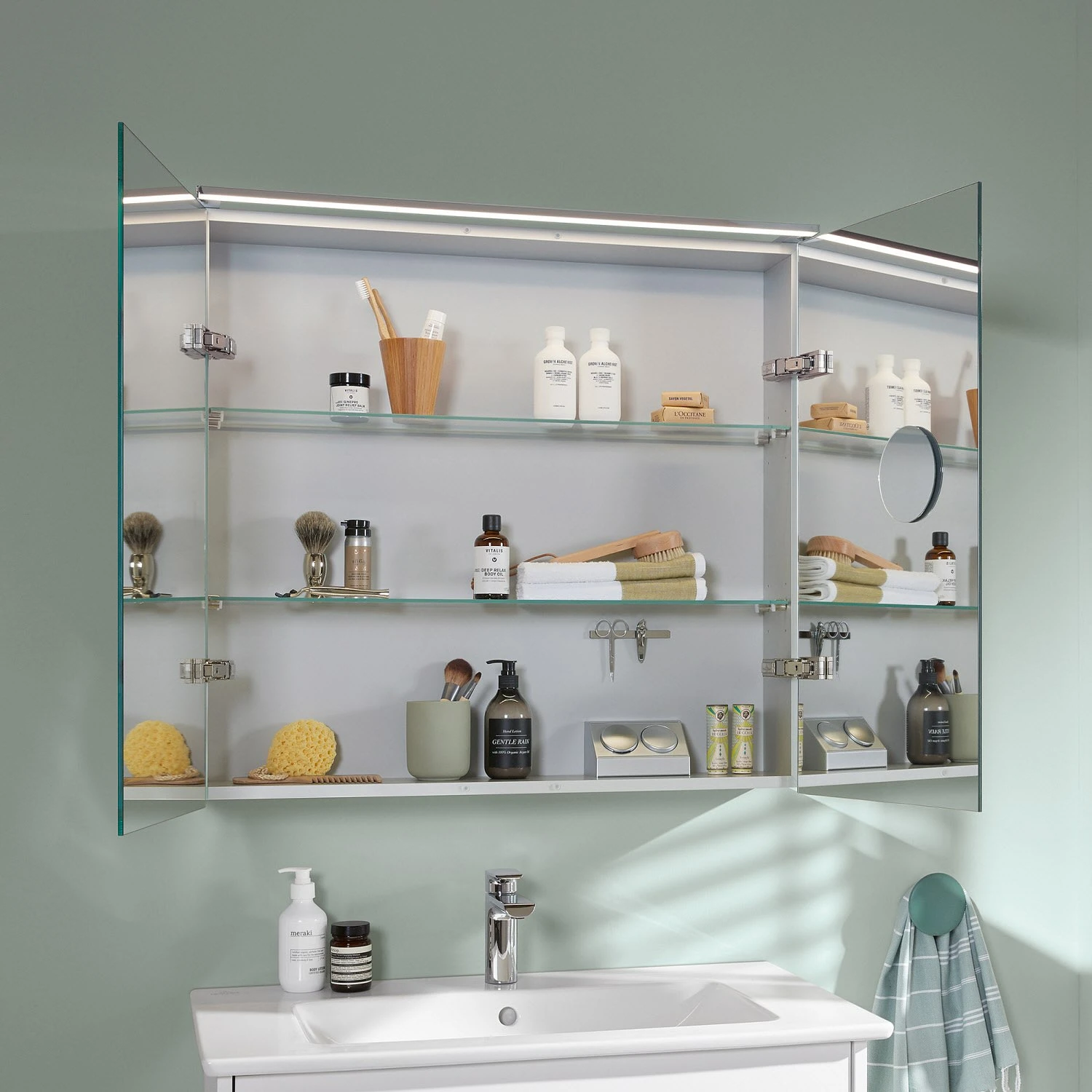 Harmonische Ergänzung zum Möbel-Set und praktisches Stauraumwunder: der Finero Spiegelschrank von Villeroy & Boch. Optisch überzeugt er mit seinem Aluminium-Korpus und einer Aufsatzleuchte , die sich über die gesamte Spiegelfläche streckt. Sie sorgt für eine hervorragende Ausleuchtung beim Schminken oder Frisieren. Bedient wird das Licht über den innenliegenden Lichtschalter, der auch einen Wechsel von Warmweiß zu Kaltweiß ermöglicht . Auf den schicken, verstellbaren Glaseinlegeböden gibt es genügend Platz für Kosmetikartikel, elektrische Zahnbürste oder Haarbürsten. Praktisch sind außerdem die innenliegende Steckdose zum Laden elektronischer Geräte und Zubehör wie Vergrößerungsspiegel und Magnetleiste für Pinzette oder Nagelschere. Öffnen lässt sich der Spiegelschrank komfortabel über die nach unten leicht überstehenden, beidseitig verspiegelten Türen. Alternativ können zusätzlich auch die beiliegenden Spiegelgriffe in Chrom angebracht werden.