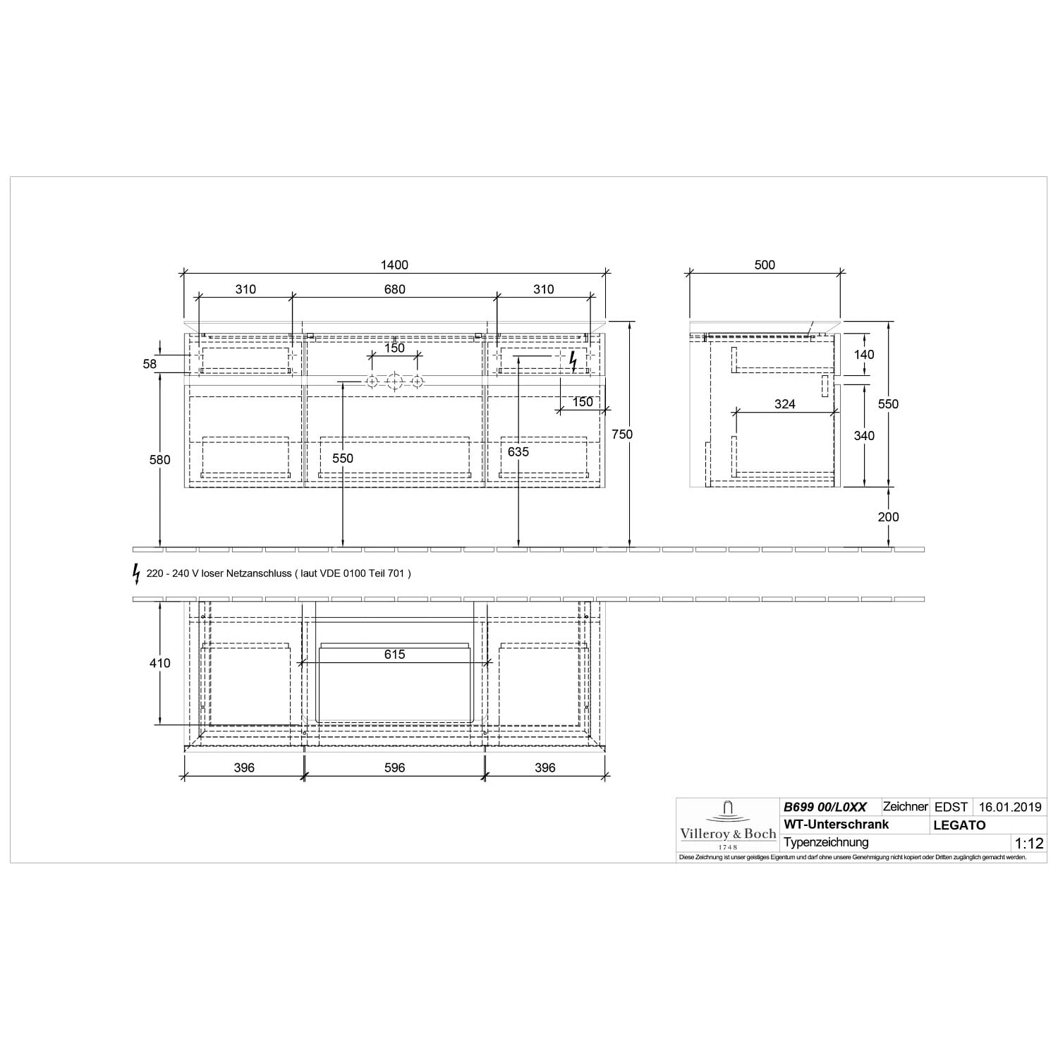 Villeroy & Boch Legato Waschtischunterschrank 140 cm mit 5 Auszügen