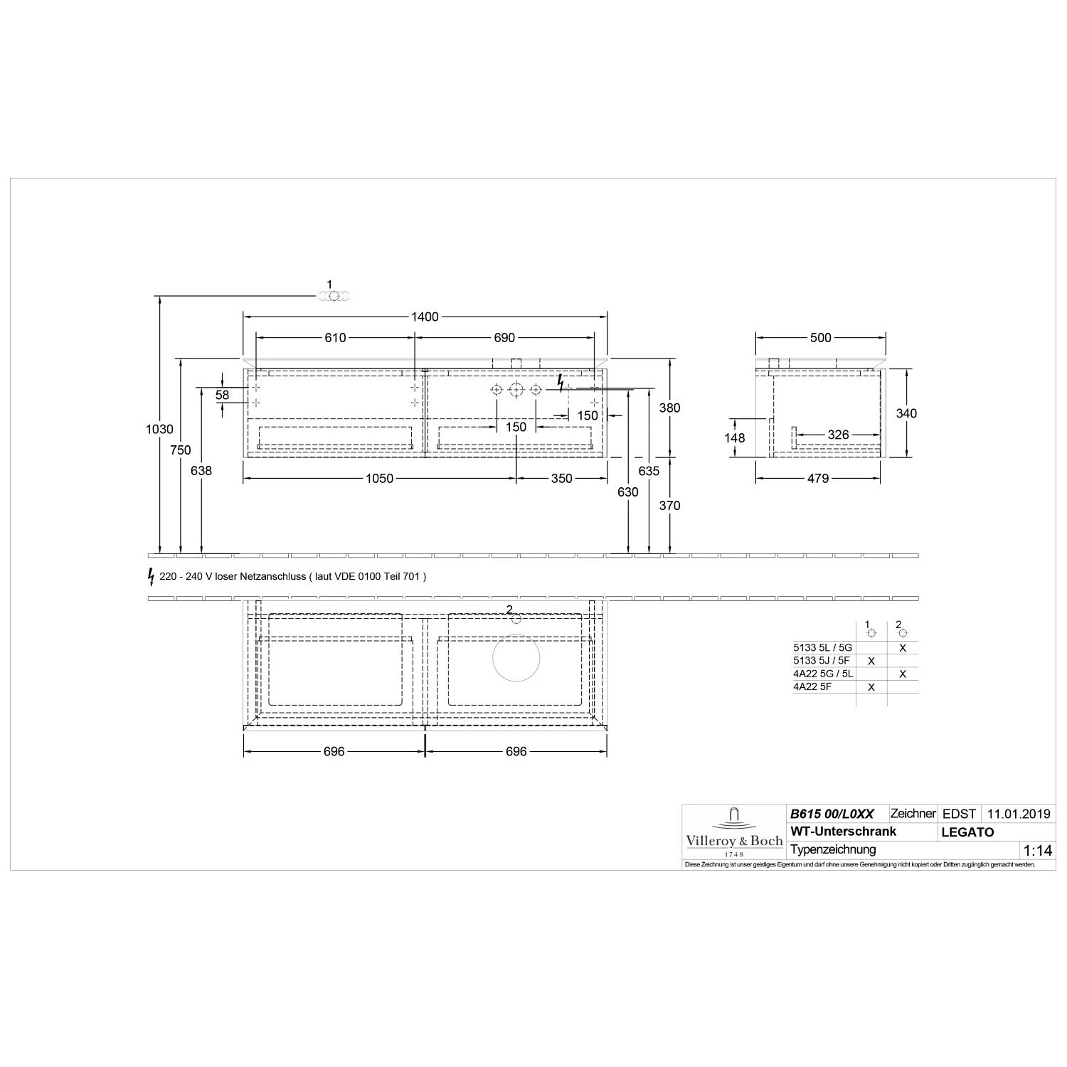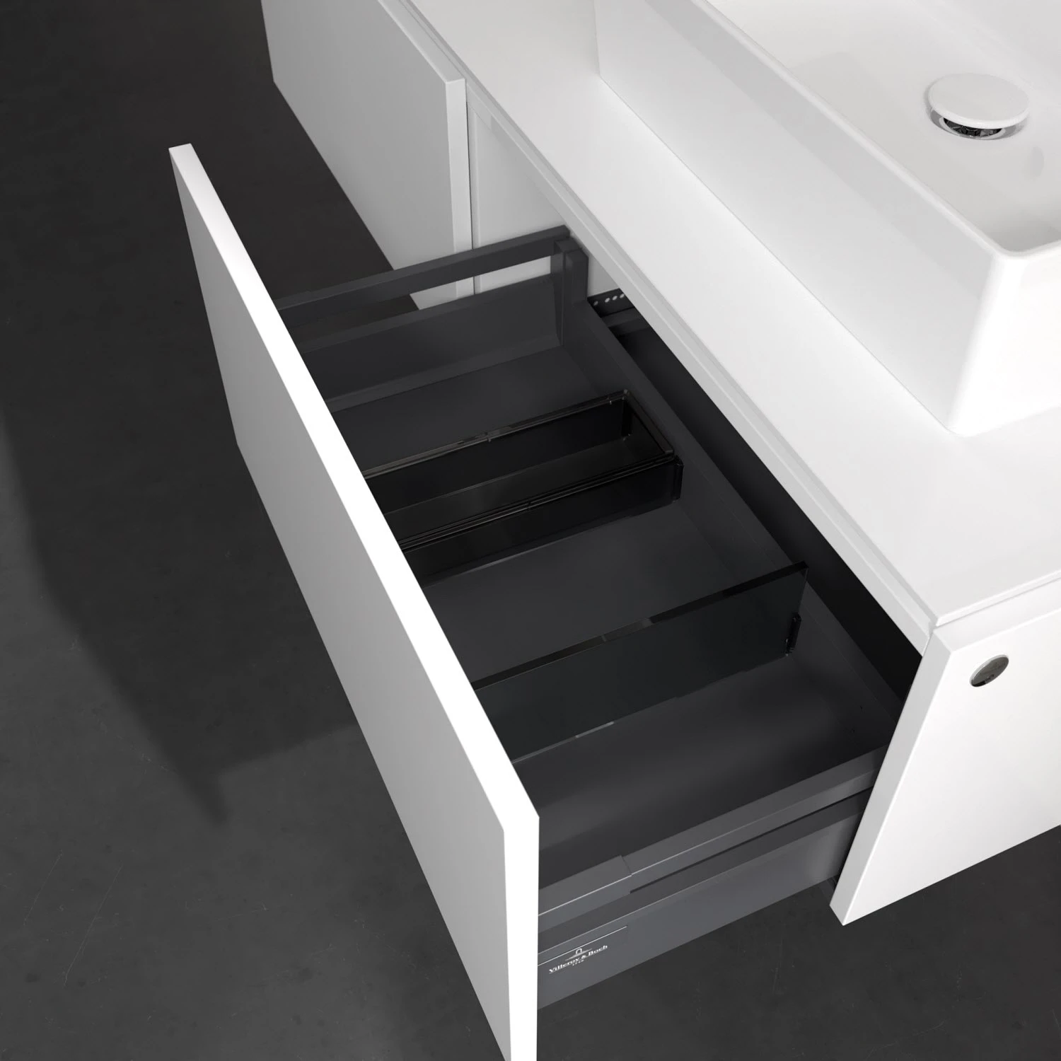 Villeroy & Boch Legato Waschtischunterschrank 140 cm mit LED-Beleuchtung, 2 Auszügen, Waschtisch rechts