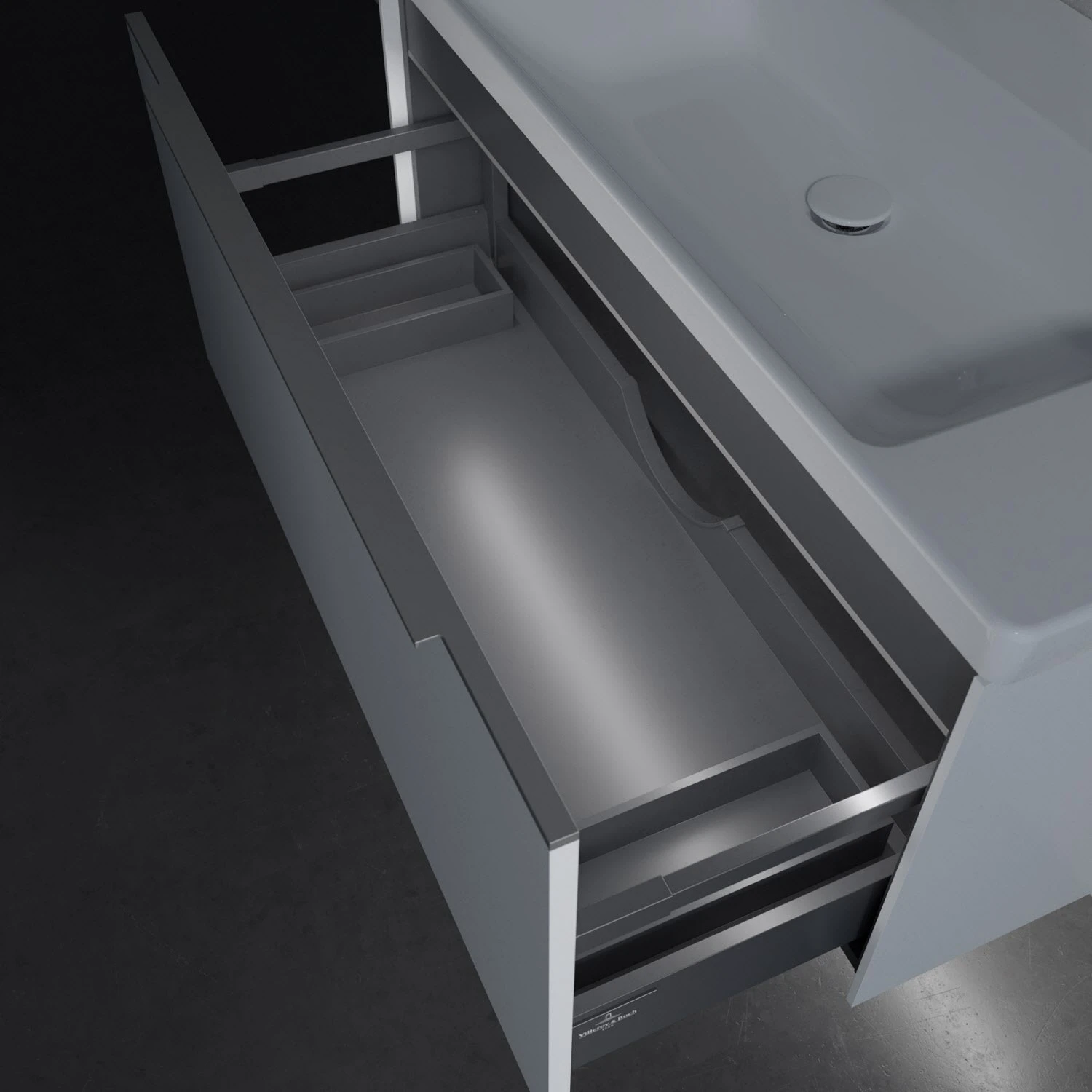 Der Waschtischunterschrank besticht durch gradliniges, zeitloses Design und großzügigen Stauraum. Eine voll ausziehbare Schublade mit rutschhemmendem Boden, Selbsteinzug-Funktion sowie zwei integrierten kleinen Accessory-Boxen bietet Platz für Pflege- und Hygieneartikel. Front und Korpus sind hochwertig verarbeitet. Die dezente Griffleiste sorgt für einfache Handhabung und bildet einen besonderen Design-Akzent.