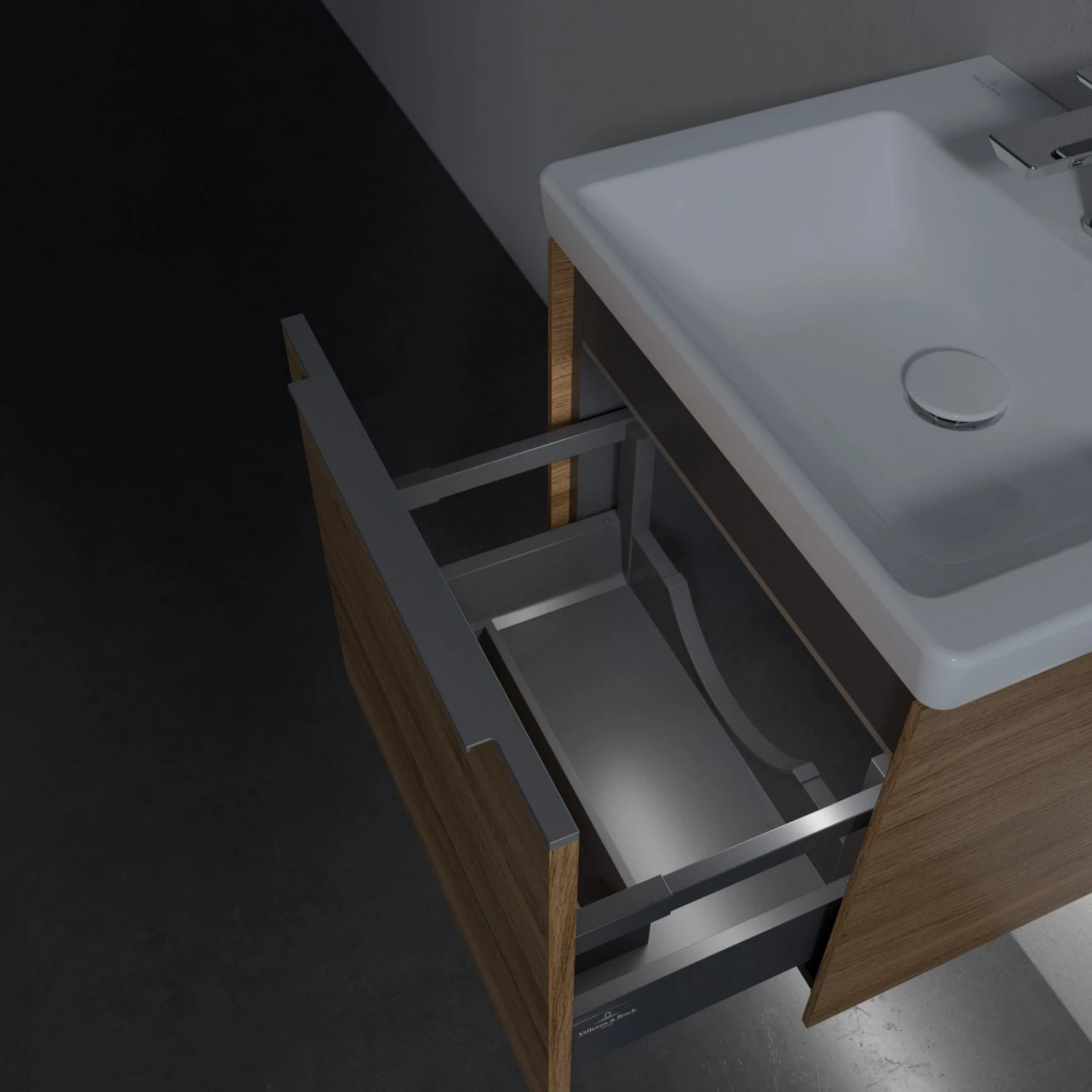 Der Waschbeckenunterschrank besticht durch gradliniges, zeitloses Design. Eine voll ausziehbare Schublade mit rutschhemmendem Boden, Selbsteinzug-Funktion sowie einer integrierten kleinen Accessory-Box bietet Platz für Pflege- und Hygieneartikel. Front und Korpus sind hochwertig verarbeitet. Die dezente Griffleiste sorgt für einfache Handhabung und bildet einen besonderen Design-Akzent.